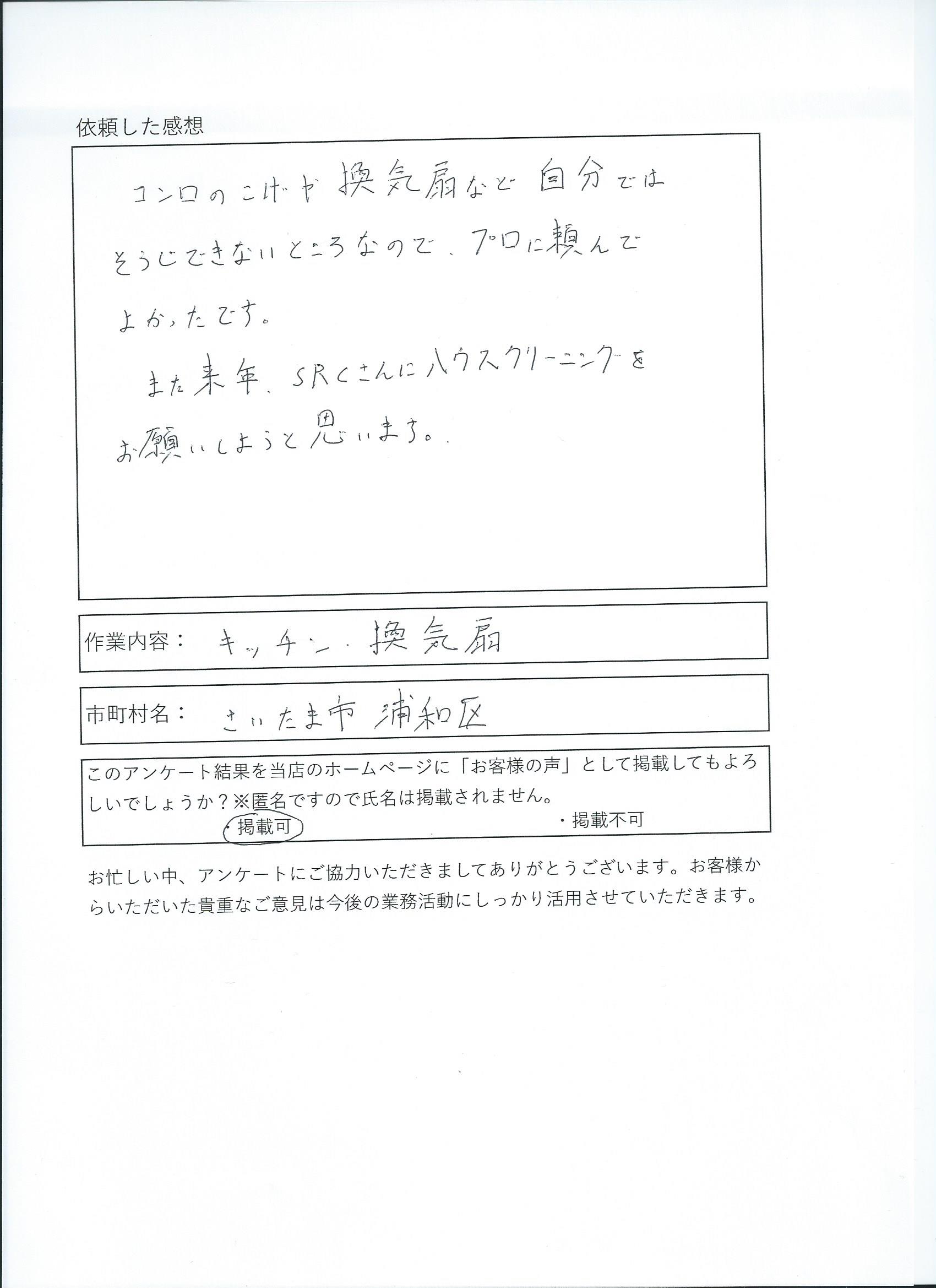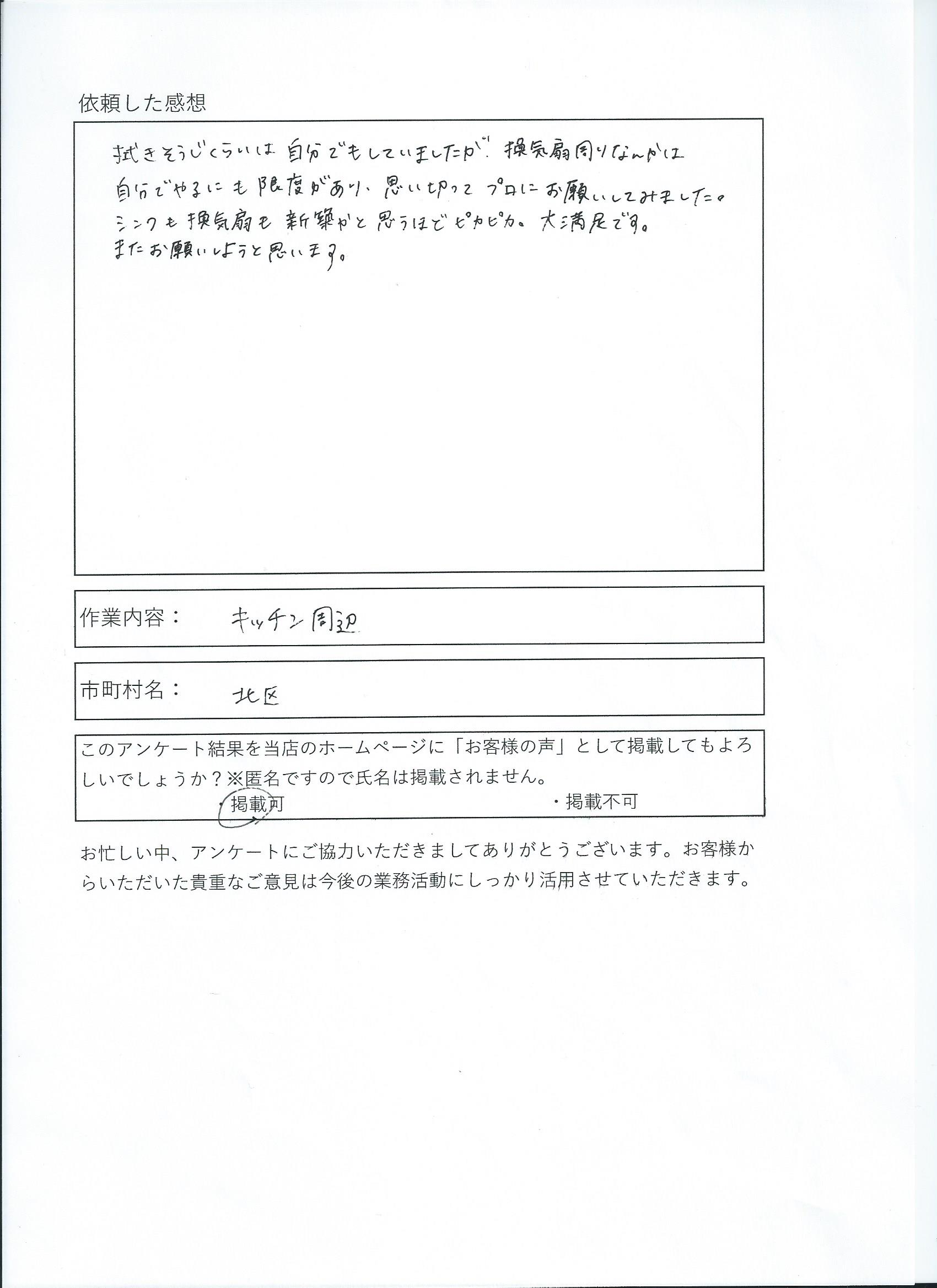 コンロの焦げや換気扇など、自分では掃除できないところなのでプロに頼んでよかったです。