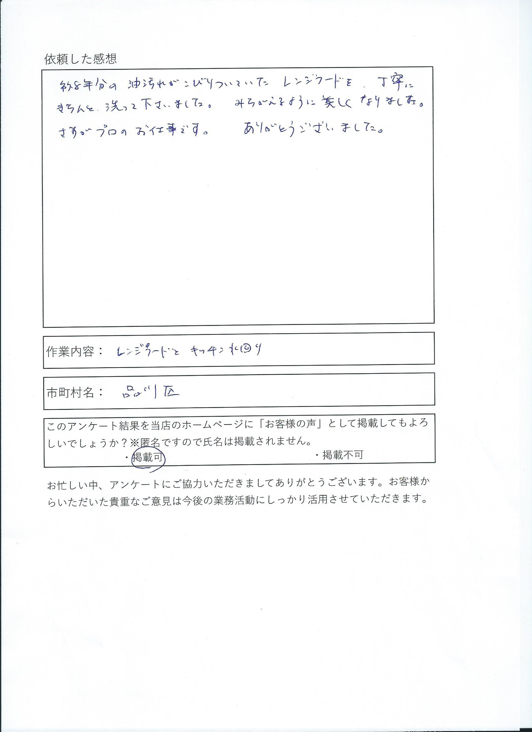 約8年分の油汚れがこびりついたレンジフードを丁寧にきちんと洗って下さいました。見違えるように美しくなりました。さすがプロのお仕事です。ありがとうございました。